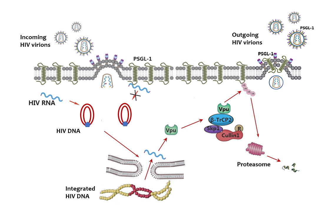 示意图:PSGL-1可以抑制病毒RNA逆转录合成DNA(1) ,也能被包装到新的病毒颗粒中,抑制其新一轮的感染(2)。病毒通过其附属蛋白Vpu结合PSGL-1并介导泛素连接酶SCF-βTrCP2泛素化PSGL-1,导致PSGL-1被蛋白酶体(proteasome)降解,从而逃逸PSGL-1对新生病毒感染的强烈抑制作用。