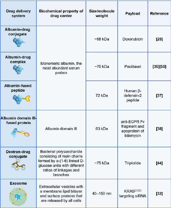 白蛋白相关的药物系统是研究最多的巨胞饮底物之一。人血清白蛋白(HSA)是人体内含量最丰富的血清蛋白, KRAS突变的胰腺癌细胞可以通过巨胞饮作用摄取胞外白蛋白并将其降解为氨基酸,作为重要的营养来源。有研究表明,将小分子药物阿霉素与天然白蛋白共价偶联,可以模拟白蛋白的内吞和细胞内转运过程,从而利用增强的巨胞饮作用扩大细胞毒性药物在KRAS 突变胰腺癌肿瘤模型中的治疗窗口。Abraxane™是白蛋白结合型紫杉醇(nab-PTX),目前与吉西他滨联合用作晚期胰腺癌的一线治疗。有研究在肺癌的转基因肿瘤模型中,通过EIPA 抑制实验和 nab-PTX 与荧光葡聚糖的亚细胞共定位实验验证了KRASG12D 的肿瘤细胞对 nab-PTX 的巨胞饮摄取;该研究还发现,在KRAS野生型的肿瘤细胞中的诱导瞬时的 KRASG12D 过表达增强了 nab-PTX 的摄取。除了小分子外,白蛋白也被用于递送蛋白质/肽类药物,多项研究报道了白蛋白与治疗性蛋白/肽的融合蛋白也可以通过巨胞饮的方式进入KRAS突变的肿瘤细胞。除了白蛋白相关的药物递送系统外,研究者们还报道了不同的药物递送载体,可以被 KRAS 突变的肿瘤细胞通过巨胞饮作用内吞,包括脂质、高分子聚合物、外泌体和无机纳米颗粒等,如图1。