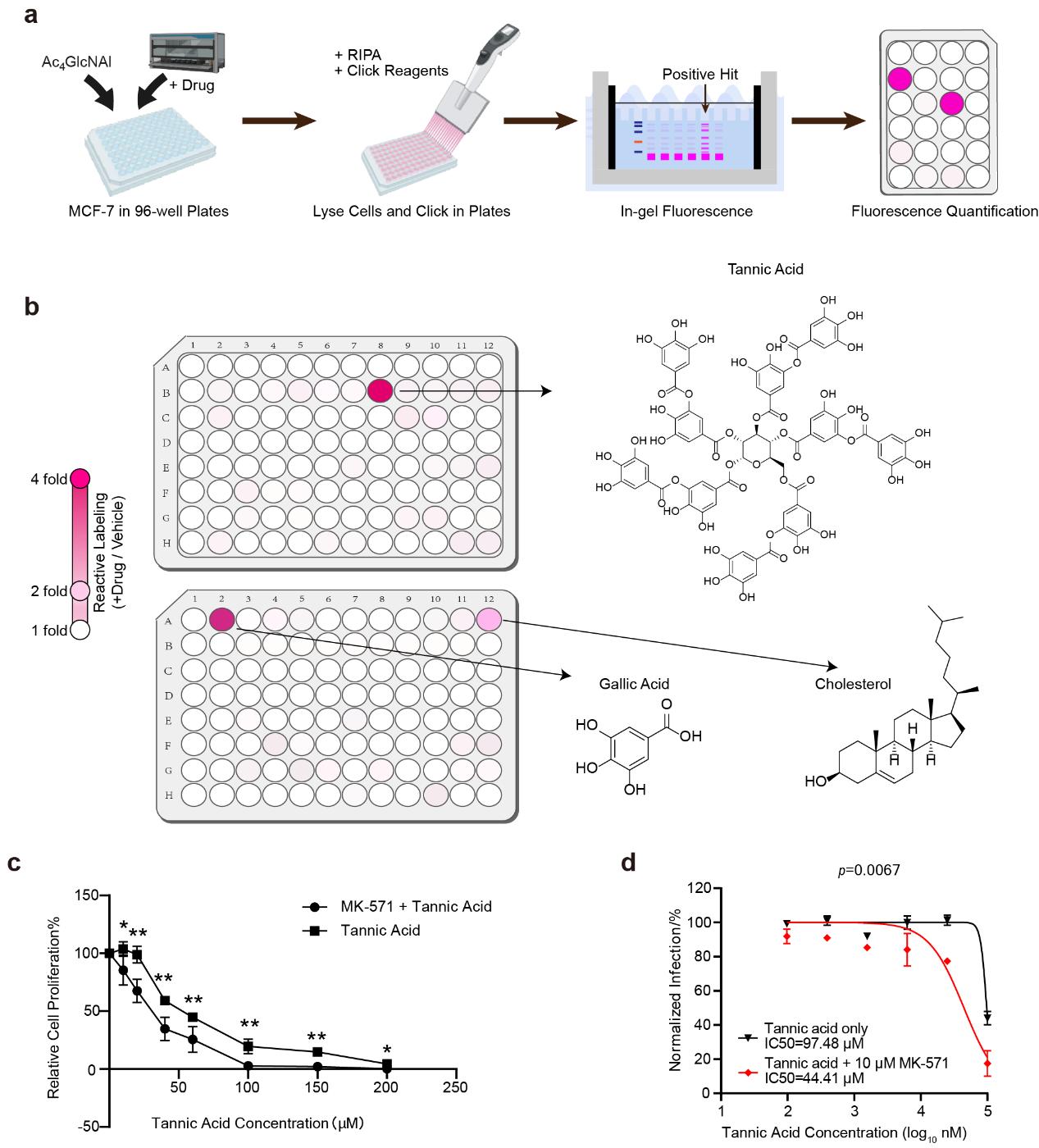作者进一步基于BRIEF建立小分子药物的外排筛选平台,对409种天然产物的外排情况进行了筛选鉴定(图3a), 从而发现了单宁酸、没食子酸和胆固醇这三种天然小分子可以由ABCC外排泵所排出(图3b)。其中单宁酸对Ac4GlcNAl标记信号的提高最为明显,因此作者进一步验证了ABCC的抑制剂是否可以增强单宁酸的药用活性。单宁酸已知具有抑制癌细胞增值和抗SARS-COV-2的活性,作者发现结合ABCC抑制剂MK-571处理,可以显著提高单宁酸的抑癌活性(图3c)和抗SARS-COV-2的活性(图3d)。