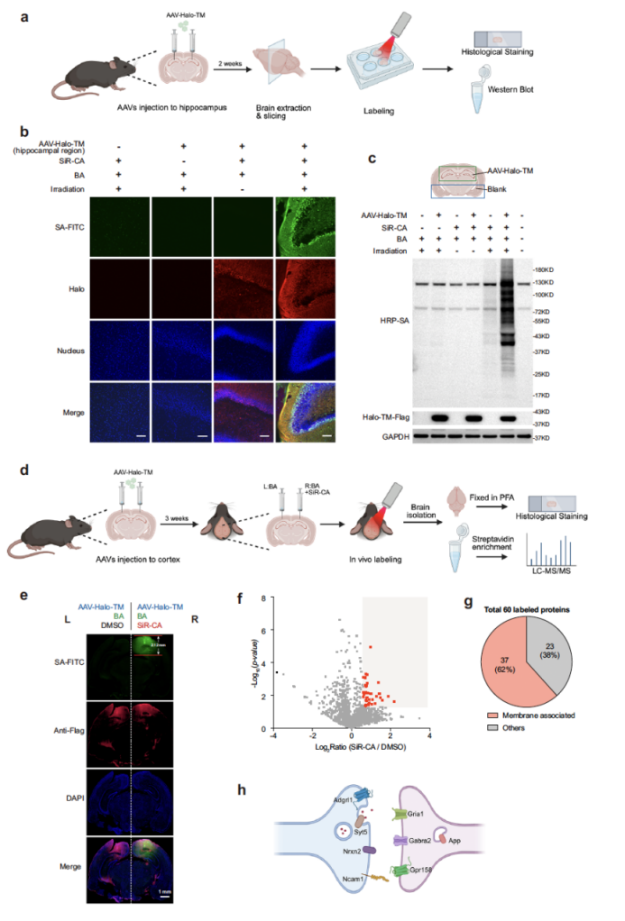 近红外光的深组织穿透性是 SeeID 的重要优势,研究团队进一步验证了其在体内的应用潜力——小鼠大脑的时空可控邻近标记。通过立体定位注射,将携带 Halo-TM(细胞膜靶向 Halo 标签蛋白)的 AAV 病毒导入小鼠海马体与视觉皮层,待病毒表达 2-3 周后,在急性脑切片中,1 μM SiR-CA 与 500 μM BA 处理结合 660 nm LED 照射,可在海马体区域观察到强烈的特异性标记信号;而在在体实验中,向小鼠视觉皮层注射 SiR-CA 与 BA 后,经 30 分钟 660 nm LED 照射,标记深度可达约 2 mm,且质谱分析鉴定出 60 种富集蛋白,其中 62% 与膜、囊泡或细胞外基质相关,包括神经递质受体(Gabra2、Gria1)、神经细胞黏附分子(Ncam1)等突触相关蛋白,证实了 SeeID 在体内深层组织中研究特定区域蛋白质互作的能力。