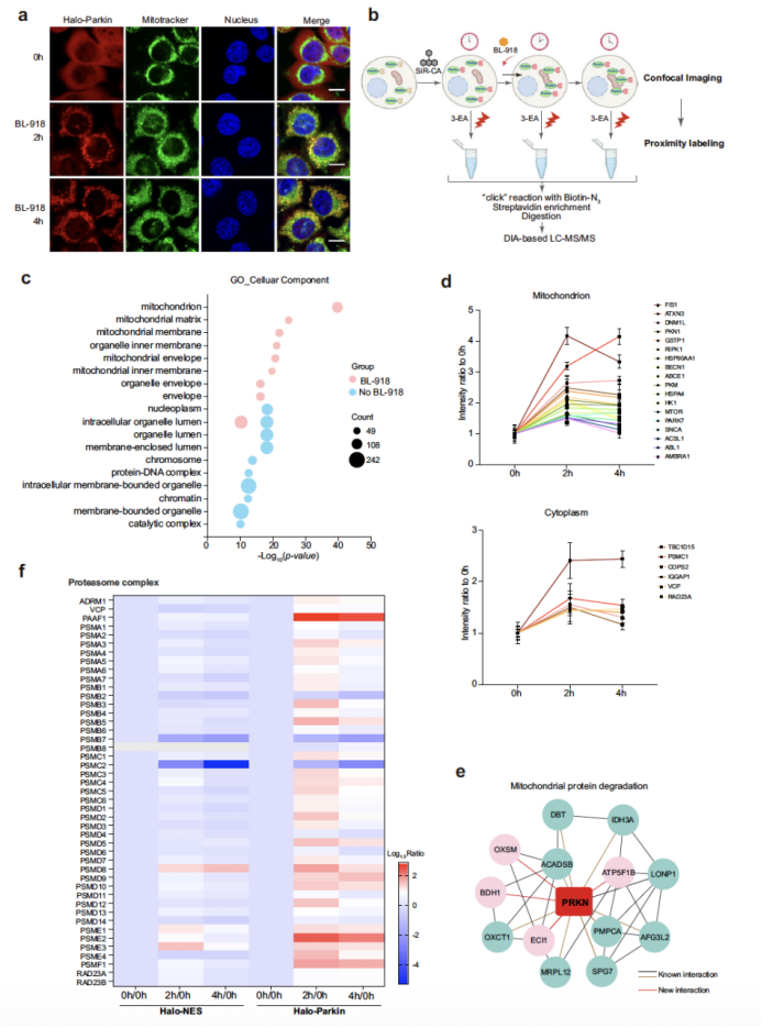 SeeID 的另一重要突破在于实现了动态蛋白质互作组的追踪,研究团队以 PINK1/Parkin 介导的线粒体自噬(mitophagy)为模型展开探索(图5)。线粒体自噬是细胞清除受损线粒体的关键过程,Parkin 的 translocation 与动态互作是其核心调控环节。研究使用小分子 BL-918 诱导 Parkin translocation,通过活细胞成像实时追踪到:0 h 时 Parkin 弥散分布于胞质,2 h 时形成囊泡样聚集并开始向受损线粒体迁移,4 h 时完全定位于线粒体(PCC 从 0.44 升至 0.85)。同时,在这三个时间点通过 SeeID 捕获 Parkin 的互作组,发现 2 h 时 45 种蛋白酶体复合物相关蛋白中有 29 种的丰度显著上升(Ratio>1.5),而 4 h 时丰度下降。这一动态变化表明,泛素 - 蛋白酶体系统在 mitochondrial 自噬早期即参与受损线粒体蛋白的降解,此前尚未有研究通过邻近标记技术揭示这一动态过程,凸显了 SeeID 在动态生物学过程研究中的独特价值。