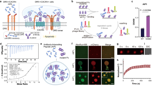 研究团队建立了一种免疫球蛋白引导的相分离系统(IgPS)。他们首先设计了Fc突变体,以避免体内内源性抗体的干扰,并通过噬菌体展示筛选出特异性结合的肽段AIP1。随后,将不同重复数的AIP1单元与荧光蛋白mCherry融合表达,生成融合蛋白mCherry-AIP1n。当这些融合蛋白与Fc突变体混合时,形成液滴状凝聚体,并表现出动态分子交换特性。实验结果表明,凝聚体的形成依赖于突变Fc与肽段的多价相互作用;低价肽或野生型Fc均无法诱导液滴形成(图1)。