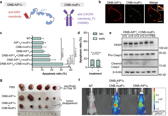研究团队构建了DR5×CXCR4靶向的IgPS系统,并验证了其在细胞膜上诱导液滴状凝聚体形成、驱动CXCR4与DR5共聚集的能力。在体外实验中,该系统能够特异性激活DR5+/CXCR4+细胞的凋亡。将不同价态的靶向DR5的DNB-AIP1n与靶向CXCR4的CNB-mutFc组合使用时,DNB-AIP13-5能够有效诱导SJSA-1细胞凋亡,同时在Western blot中检测到caspase-8、caspase-3和PARP的裂解。相比之下,该系统在DR5⁺/CXCR4⁻的HepG2细胞中未表现出明显作用(图2d)。进一步的体内实验表明,DNB-AIP14与CNB-mutFc联合给药后,DNB-AIP14在肿瘤部位显著富集,并在NOD/SCID小鼠的SJSA-1异种移植瘤模型中表现出强效的抑瘤作用。与PBS对照组相比,联合治疗组的肿瘤在给药三天后即开始缩小,且在实验结束时平均体积明显低于对照组,而DNB-AIP14单独给药仅产生轻微抑制效果。整体结果表明,DNB-AIP14/CNB-mutFc通过特异性诱导DR5+/CXCR4+细胞凋亡,有效抑制肿瘤生长(图2)。