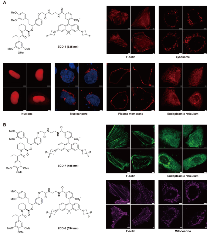在功能验证中,研究人员将FKBPC小肽分别融合到Lifeact、LAMP1、mEmerald-NLS、Nup62、KRAS、Sec61β等多种蛋白上,结果均准确再现了这些蛋白在细胞骨架、溶酶体、细胞核、核孔、细胞膜及内质网等亚细胞结构中的分布模式(图3 A)。进一步实验中,团队还尝试了不同颜色的小分子探针(如ZCD-7与ZCD-8),发现均可实现清晰的荧光标记(图3 B),表明LiSC-tag对不同颜色探针均具有良好的兼容性,为后续开展多色成像研究奠定了基础。