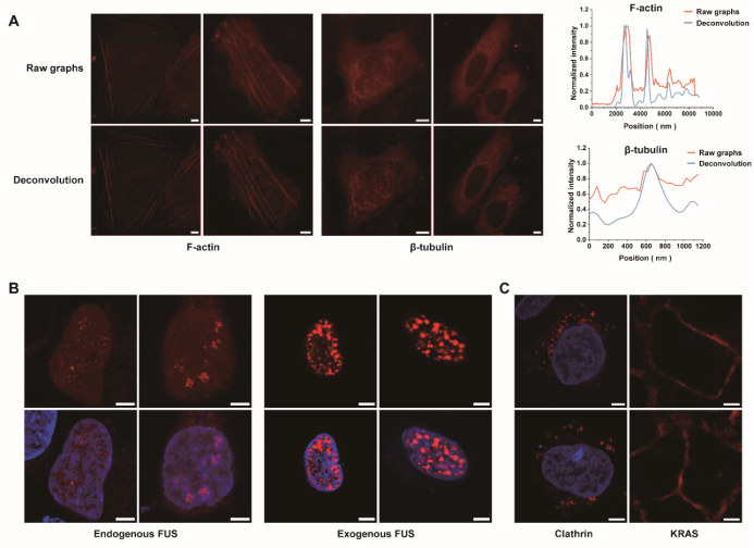 在内源蛋白标记实验中,研究团队利用CRISPR基因编辑技术,将FKBPC小肽敲入到Actin、Tubulin、Clathrin和RNA结合蛋白FUS等内源基因中,并在活细胞中成功观察到其天然分布模式(图6 A-C)。相比过表达系统,内源标记的蛋白在结构保持与生理功能上更加真实。例如,在FUS蛋白的成像实验中,过表达导致其核内液滴数量与大小异常,而内源性标记则如实呈现了其自然状态(图6 B)。这充分说明,LiSC-tag不仅体积小、易于敲入,还能够在不扰乱蛋白功能的前提下,实现对内源性蛋白的精准成像。