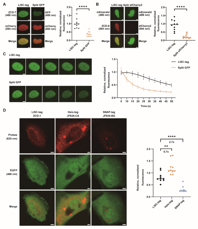 在性能评估中,研究团队将LiSC-tag与现有的多种标记体系进行了系统比较。与split GFP和split sfCherry2相比,LiSC-tag展现出显著优势,其荧光亮度分别提升了2.6倍和4.0倍(图4 A, B),光漂白半衰期较split GFP延长了2.7倍(图4 C),证明其在活细胞成像中具有更高的亮度和更强的光稳定性。进一步与Halo-tag和SNAP-tag的比较结果显示,LiSC-tag的亮度接近Halo-tag,而远高于SNAP-tag(图4 D)。这些数据表明,LiSC-tag在保持小分子量的同时,兼具与自标记蛋白标签相当的光物理性能,成功突破了传统小型标签性能不足的限制。