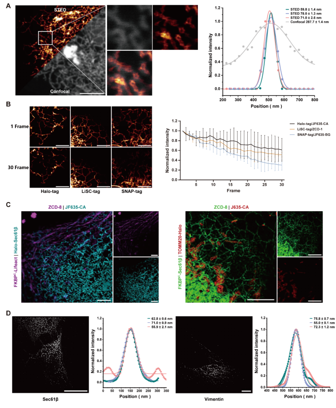 在超分辨显微实验中,LiSC-tag展现出极强的适用性。在活细胞STED成像中,研究人员成功获得了分辨率达60-70 nm的内质网图像(图5 A),并在长时间拍摄中依然保持了良好的抗光漂白性能(图5 B)。在双色STED成像实验中,LiSC-tag与Halo-tag联合标记的微丝与内质网、或内质网与线粒体均被清晰区分,体现了其与其他标签的高度兼容性(图5 C)。进一步在STORM成像中,LiSC-tag标记的内质网与中间丝均实现了约50 nm的分辨率重建,结构细节清晰可辨(图5 D)。最后,在活细胞SIM成像实验中,LiSC-tag 同样表现出稳定的荧光性能,能够精准描绘微丝与微管的骨架分布。这些结果共同证明,LiSC-tag可广泛应用于多种超分辨技术,为活细胞高分辨率成像提供了强有力的工具平台。