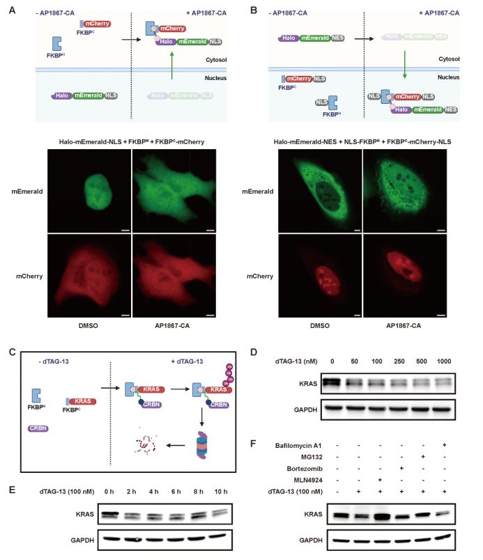 更值得关注的是,LiSC-tag在蛋白功能操控方面同样展现出独特潜力。研究团队通过设计带有化学连接基团的配体,实现了蛋白在细胞核与细胞质之间的可控运输(图7A, B),从而能够精确调节蛋白的亚细胞定位。此外,LiSC-tag还可以与小分子降解剂dTAG-13联合使用,用于特异性降解KRAS等关键蛋白。实验结果表明,当KRAS融合FKBPC小肽后,经dTAG-13处理数小时即可观察到其蛋白水平显著下降,且该过程依赖于泛素-蛋白酶体途径完成(图7 C-F)。以上发现说明,LiSC-tag不仅是一个高效的成像工具,更是一种能够实现蛋白动态操控的多功能平台。