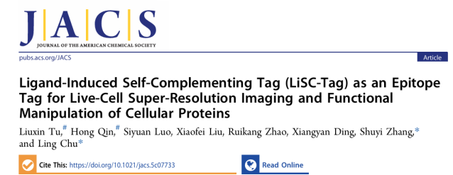 2025年9月18日,清华大学药学院储凌课题组在《Journal of the American Chemical Society》期刊发表了题为“Ligand-induced Self-Complementing tag (LiSC-tag) as an epitope tag for live-cell super-resolution imaging and functional manipulation of cellular proteins”的研究论文。本研究基于分裂FKBP F36V蛋白开发了一种新型表位标签LiSC-tag,实现了在活细胞中的超分辨成像,并可用于内源蛋白标记与常规成像,同时拓展到蛋白定位调控和靶向降解,为蛋白质动态研究与功能解析提供了全新的技术工具。