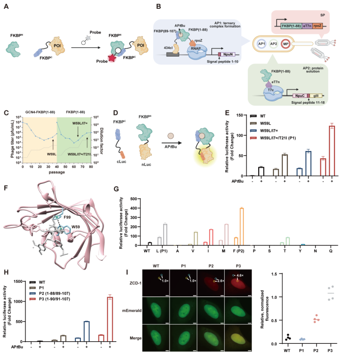 研究团队首先从分裂FKBP F36V蛋白出发,设计了配体依赖的自互补系统。研究人员引入了噬菌体辅助非连续进化(PANCE)方法,通过双重正交选择同时提升分裂片段的可溶性表达与配体依赖的三元复合物形成效率(图2 B)。在此基础上,团队结合结构分析进行关键氨基酸突变(图2 F, G),并通过切割位点的系统优化(图2 H)进一步增强了大小片段在配体诱导下的互补能力。经过这一系列“三重改造”,最终获得的LiSC-tag在可溶性表达及配体依赖的自互补效率方面均得到显著提升,从而为其在活细胞成像中的应用奠定了基础。