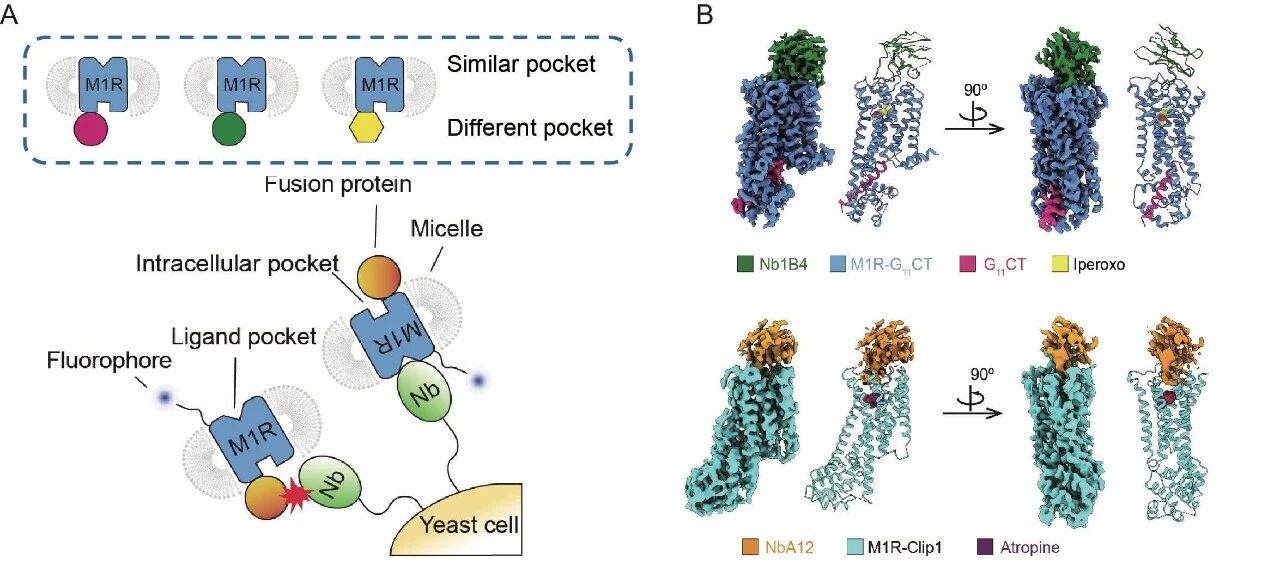 图2:GPCR胞外纳米抗体筛选 (A)胞内正交筛选策略 (B)本工作筛选得到的构象选择性纳米抗体与M1R受体的冷冻电镜结构