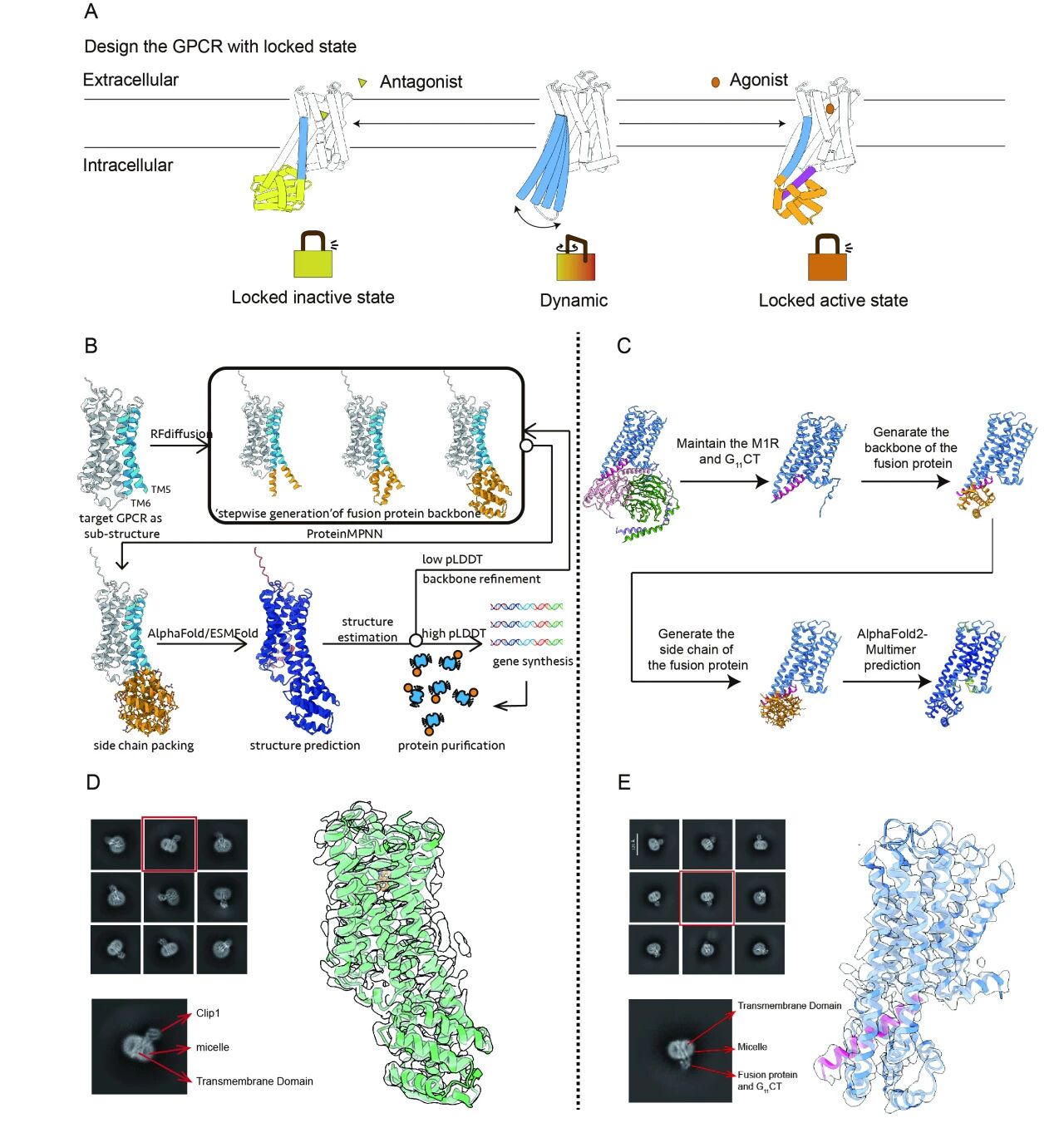 图1:融合蛋白设计 (A)设计融合蛋白稳定GPCR的非激活态和激活态构象 (B)GPCR稳定在非激活态的M1R-Clip设计流程 (C)GPCR稳定在激活态的M1R-G11CT设计流程 (D)M1R-Clip1的冷冻电镜结构 (E)M1R-G11CT的冷冻电镜结构