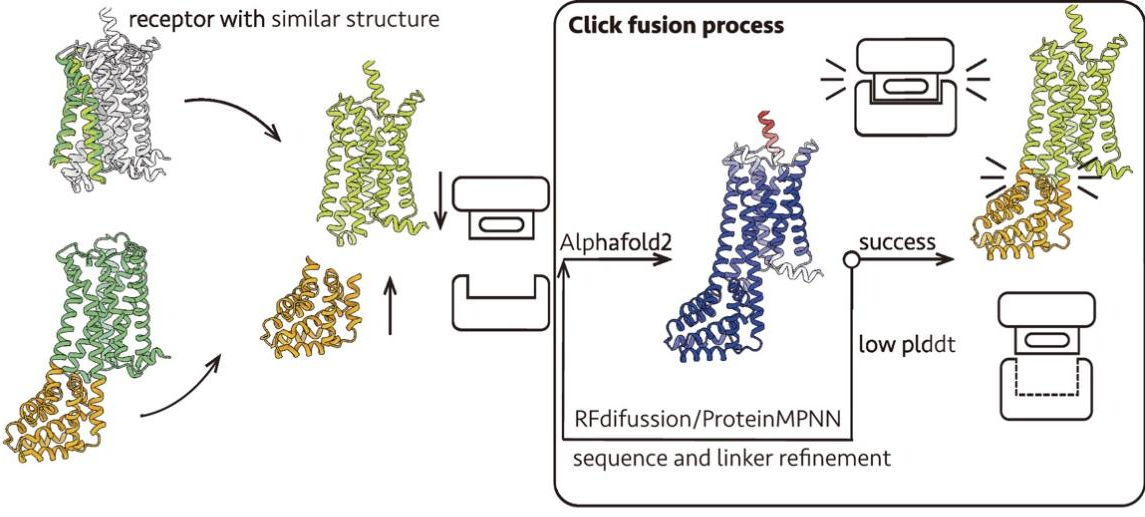 近日,清华大学药学院刘翔宇实验室在《PNAS》杂志先后发表了两项研究成果,提出了一种名为“Click Fusion”的研究策略。他们利用近年来兴起的机器学习驱动的蛋白质设计工具,深入探索了蛋白质从头设计在GPCR融合蛋白设计中的应用潜力,为解析非激活态GPCR结构以及筛选GPCR新配体提供了具有广阔应用前景的新工具。