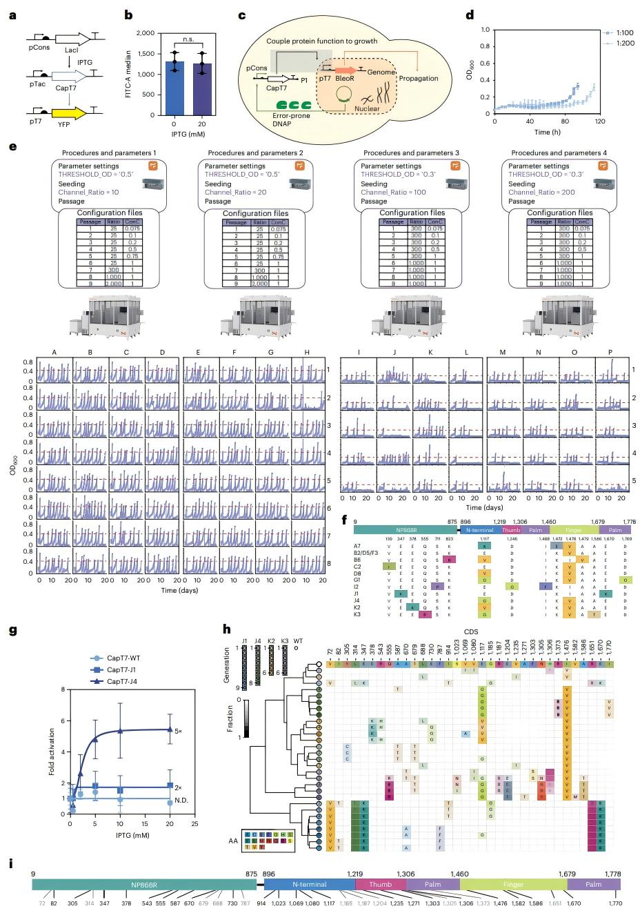 利用该系统对活性近乎为零的前体CapT7进行蛋白质功能进化。为了赋予T7 RNAP加帽能力,以扩大其应用效果,将非洲猪瘟病毒的加帽酶与其进行融合,有望应用于哺乳动物细胞中的正交基因表达和疫苗开发等领域。在该平台上进行了一个完全自动化多组平行的定向进化过程,在96孔板中并行启动>100条独立进化线,每天9个循环、连续25天。再接入连续流式装置追加10天高浓度筛选,最终获得变体CapT7-V14。该变体在酵母内使靶基因表达提升30倍;在体外转录反应中可合成带帽mRNA;在HEK293T细胞中,其驱动的荧光蛋白水平与CMV、EF1α等哺乳动物强启动子相当,实现“原核启动子直接用于人源细胞”的跨界表达。