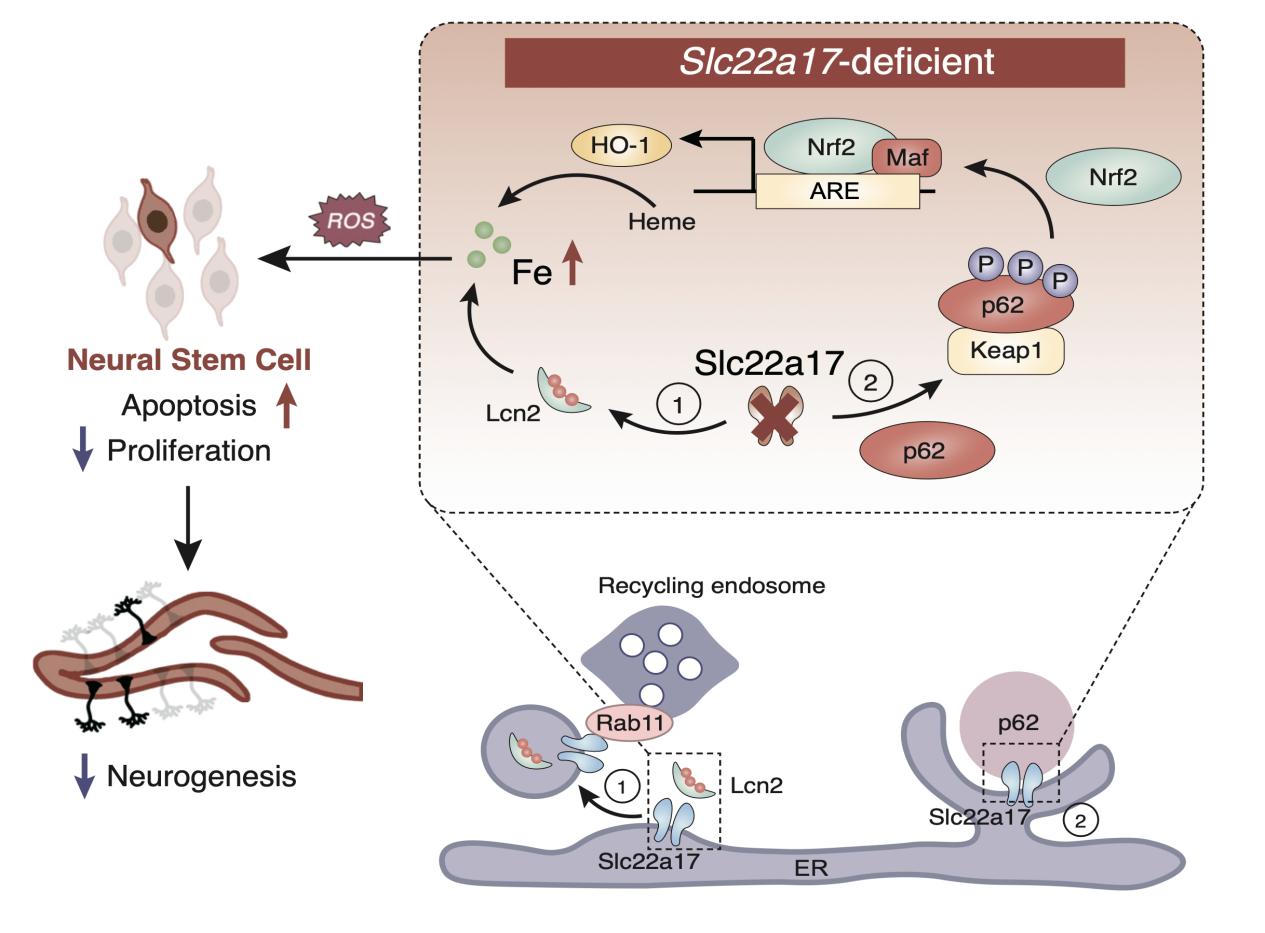 图3 Slc22a17调控铁代谢和神经发生的机制图