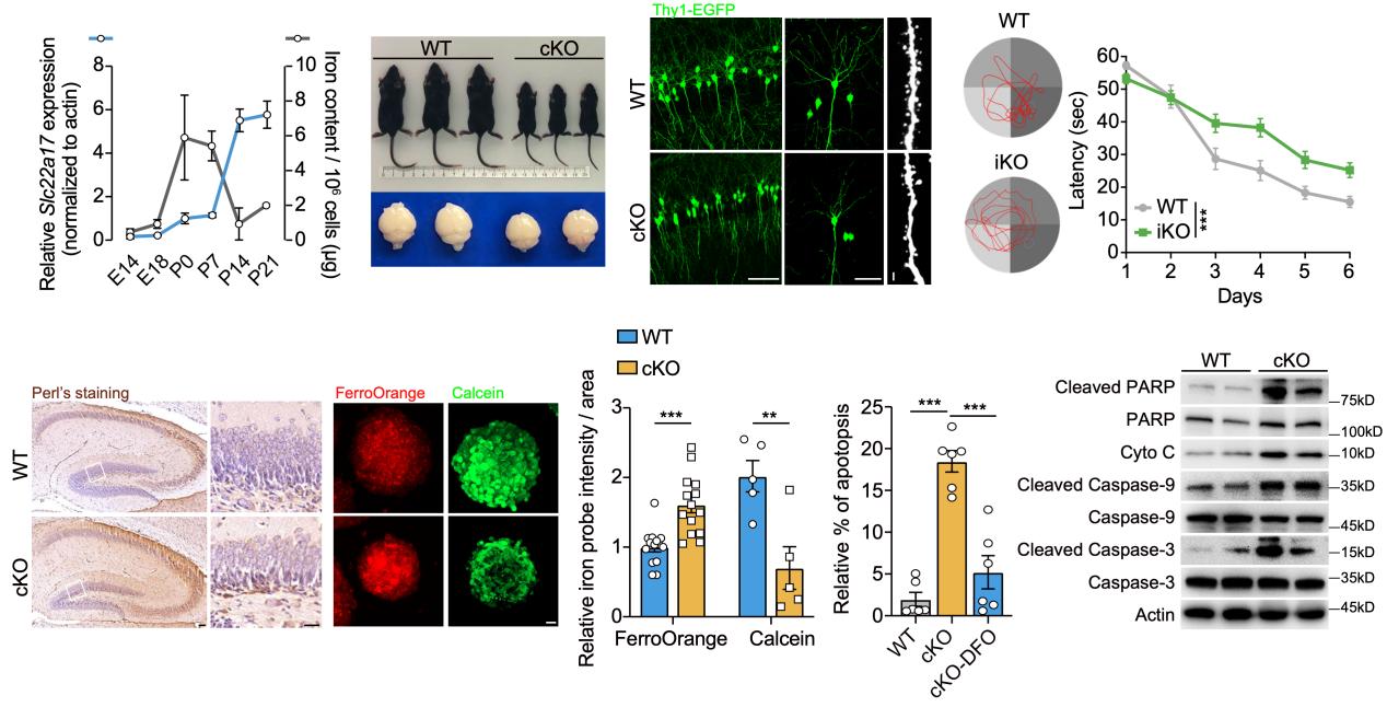 铁是维持脑发育和神经功能不可或缺的微量元素,其稳态平衡精细而脆弱——既驱动神经发生、突触形成和髓鞘化等关键过程,又在过量时如“双刃剑”般催生活性氧(ROS)积累,诱发氧化应激,损害神经干细胞更新与突触可塑性,最终危及认知记忆功能。SLC22A17是维持脑内铁稳态的关键转运蛋白,直接参与铁的跨膜转运与氧化应激反应的调控。它最初被鉴定为脂质运载蛋白lipocalin-2(LCN2)的受体,能够识别并结合不同铁负载状态的LCN2,从而精确调节细胞内外的铁流动。然而,尽管SLC22A17在中枢神经系统中广泛表达,科学界对于SLC22A17在脑内发挥的生理功能,以及维持铁稳态的具体机制尚不清楚。