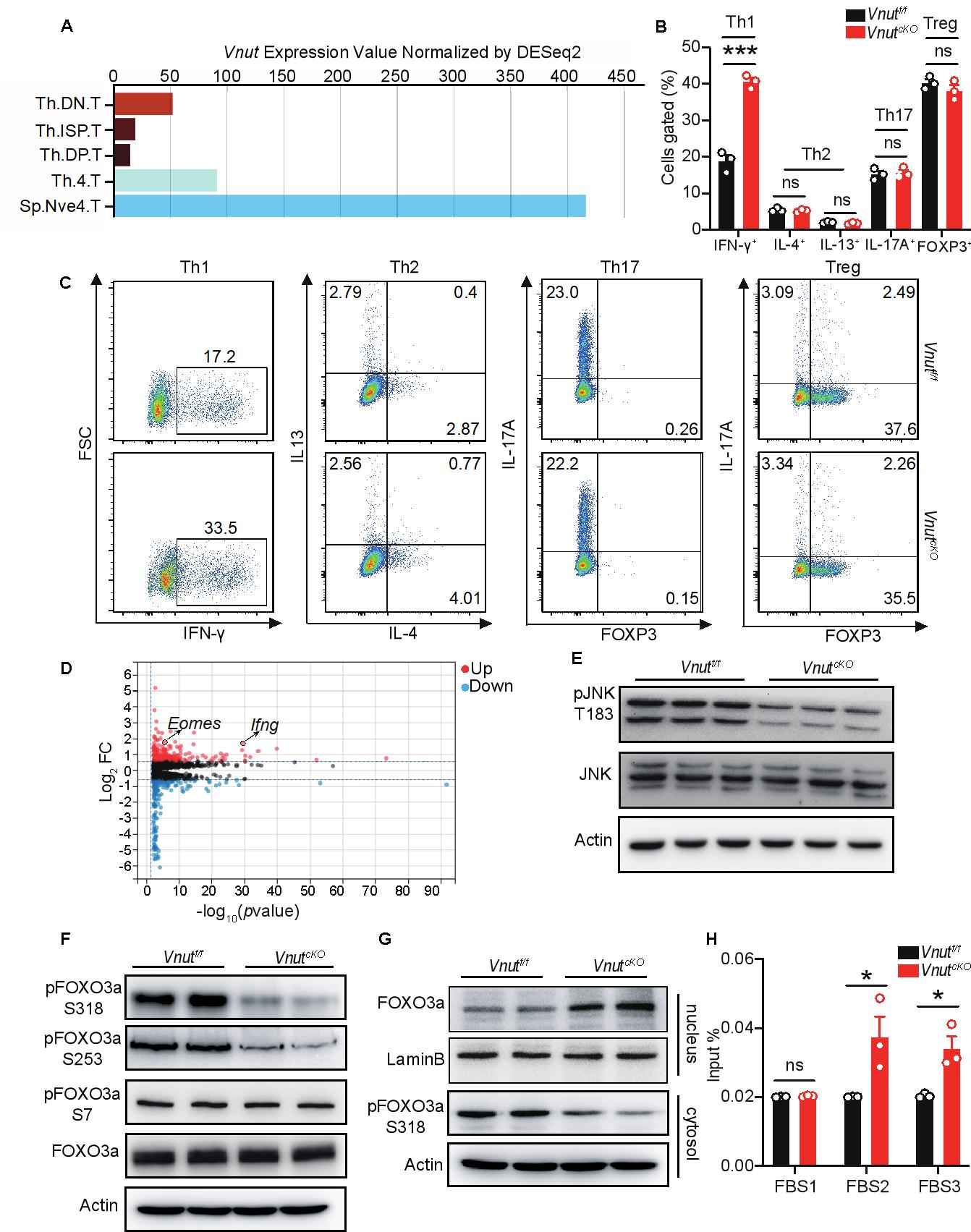 本研究首先发现VNUT在CD4+ T细胞发育成熟后,其表达量呈显著上调趋势(图 1A)。为探究VNUT在CD4+ T细胞分化中的功能,利用loxp-cre条件性敲除技术,构建了CD4+ T细胞特异性Vnut基因敲除(cKO)小鼠模型。体外诱导分化实验结果显示,与野生型相比,cKO小鼠来源的CD4+ T细胞向Th1亚型的分化能力显著增强,具体表现为Th1细胞比例升高及特征细胞因子IFN-g表达上调(图 1B、C)。为解析上述表型的分子机制,对cKO小鼠来源的Th1细胞进行RNA-seq分析,发现转录因子Eomes的mRNA水平均显著升高(图 1D)。进一步的机制探究表明,VNUT通过调控CD4+ T细胞受体(TCR)刺激后的ATP释放,进而影响ATP受体P2X7R的活化状态;而P2X7R的活化差异会进一步传导至下游信号通路,调控JNK激酶的磷酸化水平(图 1E)。后续实验证实,磷酸化的JNK可直接作用于转录因子FOXO3a,通过磷酸化修饰调控其核质穿梭及亚细胞定位(图 1F、G),进而影响FOXO3a对Eomes基因的转录调控活性(图 1H)。最终,通过这一“VNUT-ATP-P2X7R-JNK-FOXO3a-Eomes”的级联调控通路,VNUT实现了对CD4+ T 细胞向Th1亚型分化过程的调控。