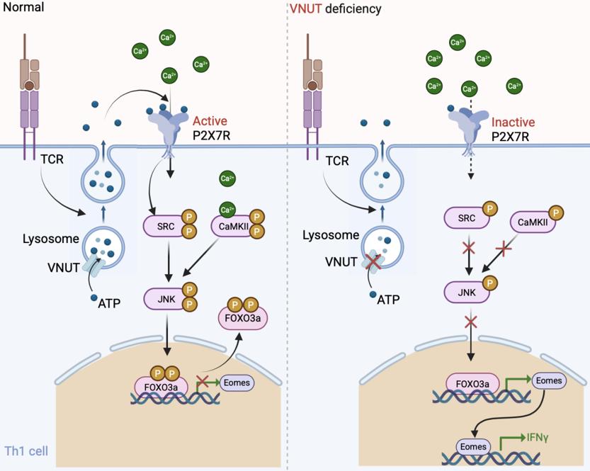 2025年12月19日,清华大学药学院陈立功课题组及其合作者以“VNUT介导的ATP释放通过P2X7R-JNK-FOXO3a-Eomes信号级联抑制辅助性T细胞(Th)1型分化”(VNUT-mediated ATP release suppresses T helper (Th) 1 cell differentiation via the P2X7R-JNK-FOXO3a-Eomes signaling cascade)为题在《科学进展》(Science Advances)杂志在线发表研究论文,该研究报道了ATP转运蛋白VNUT通过调控P2X7R-JNK-FOXO3a-Eomes信号通路对Th1细胞的分化产生了调控作用。