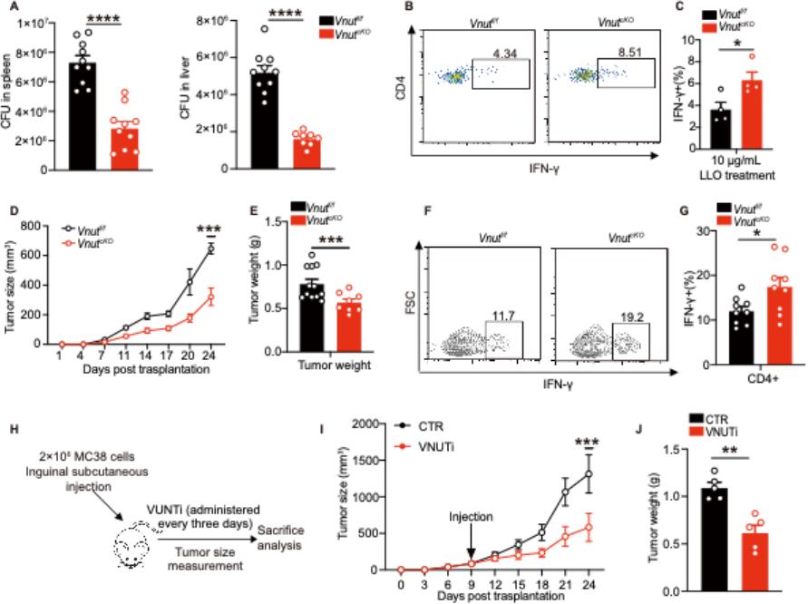进一步功能验证实验表明,Vnut基因敲除可通过增强Th1细胞的效应功能,调控宿主的抗感染与抗肿瘤应答:一方面能显著提升小鼠对单核增生性李斯特菌感染的清除能力,增强机体抗感染免疫力(图2A-C);另一方面可有效抑制肿瘤组织的生长增殖,展现出明确的抗肿瘤活性(图2D-G)。此外,VNUT特异性抑制剂的干预实验显示,其同样能发挥一定的肿瘤生长抑制作用(图2H-J)。结合前文分子机制研究结果,上述数据共同证实,VNUT通过调控Th1细胞分化及功能,参与调控宿主抗感染和抗肿瘤免疫应答,提示VNUT有望成为抗感染与抗肿瘤治疗的潜在药物靶点。