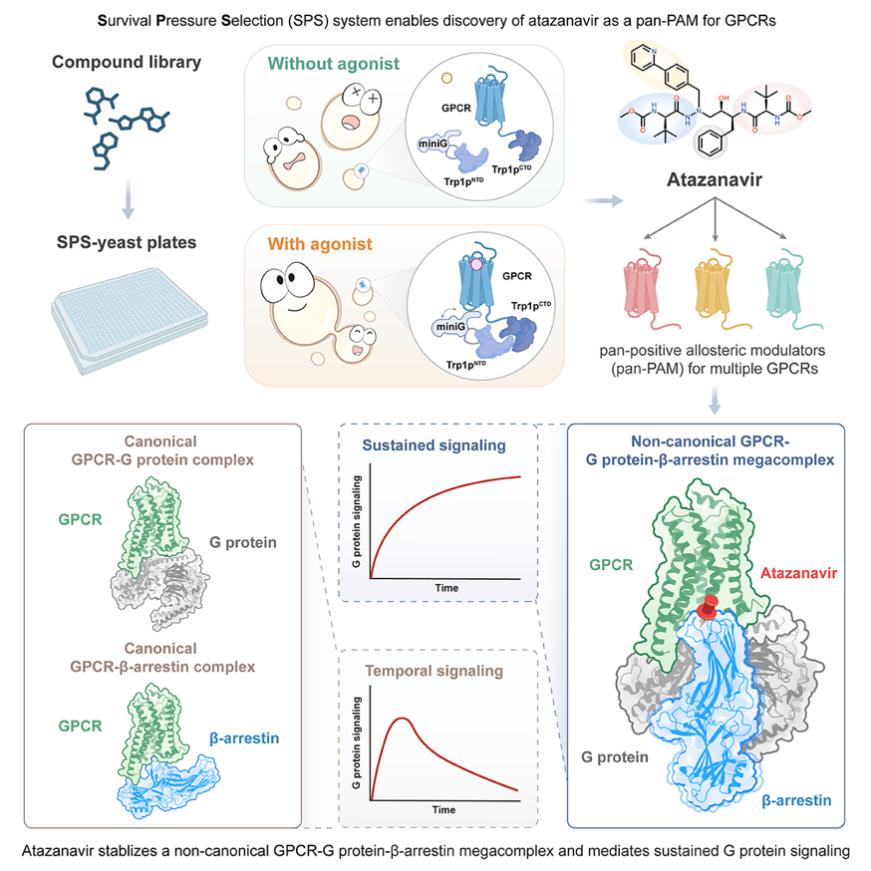 2026年1月27日,清华大学药学院、北京生物结构研究中心及清华-北大生命科学联合中心刘翔宇课题组在《细胞》(Cell)在线发表重要研究成果,题为《通用型别构激动剂稳定的GPCR-G蛋白-β-arrestin超级复合物》(A GPCR-G protein-β-arrestin megacomplex enabled by a versatile allosteric modulator)。该研究通过自主建立的新型GPCR药物筛选平台(SPS方法),首次发现艾滋病临床药物阿扎那韦是一种可作用于多种GPCR的通用型正向别构调节剂(pan-positive allosteric modulator,pan-PAM),并能介导G蛋白信号的持续激活。冷冻电镜结构进一步表明,阿扎那韦如同“分子胶水”,促成GPCR、G蛋白与β-arrestin三者形成超级复合物,使原本对立的G蛋白与β-arrestin信号通路实现“化敌为友”的共存。这项工作拓展了对GPCR信号调控的理解,为创新药物开发提供了全新视角。