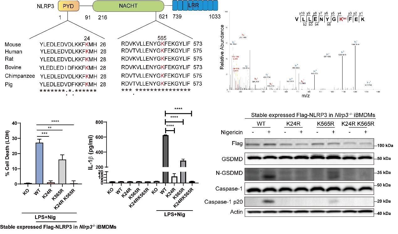 研究团队通过研究巨噬细胞焦亡的代谢特征定位到差异代谢物乳酸,系统性研究了乳酸对巨噬细胞焦亡的调控和分子作用机制。作者分别通过化学干预和基因敲降的方式对细胞内乳酸生成进行调控,发现乳酸调控NLRP3炎症小体激活介导的细胞焦亡而不影响AIM2炎症小体的激活。在机制研究上,作者定位到乳酸会促进NLRP3招募下游接头蛋白ASC和激活,通过免疫印迹分析发现NLRP3蛋白存在乳酸化修饰,并且NLRP3与乳酰转移酶AARS2存在相互作用。作者进一步通过质谱鉴定到了NLRP3的乳酸化位点并对这些位点进行突变验证以及在巨噬细胞中进行了功能学验证,发现在Nlrp3-/-的iBMDMs细胞中稳转了K24R和K565R双突变NLRP3后能显著抑制NLRP3激活介导的细胞焦亡,并且能明显减弱NLRP3的乳酸化程度。随后在小鼠多菌群感染的疾病模型中,研究团队也证明了乳酸对疾病的影响。