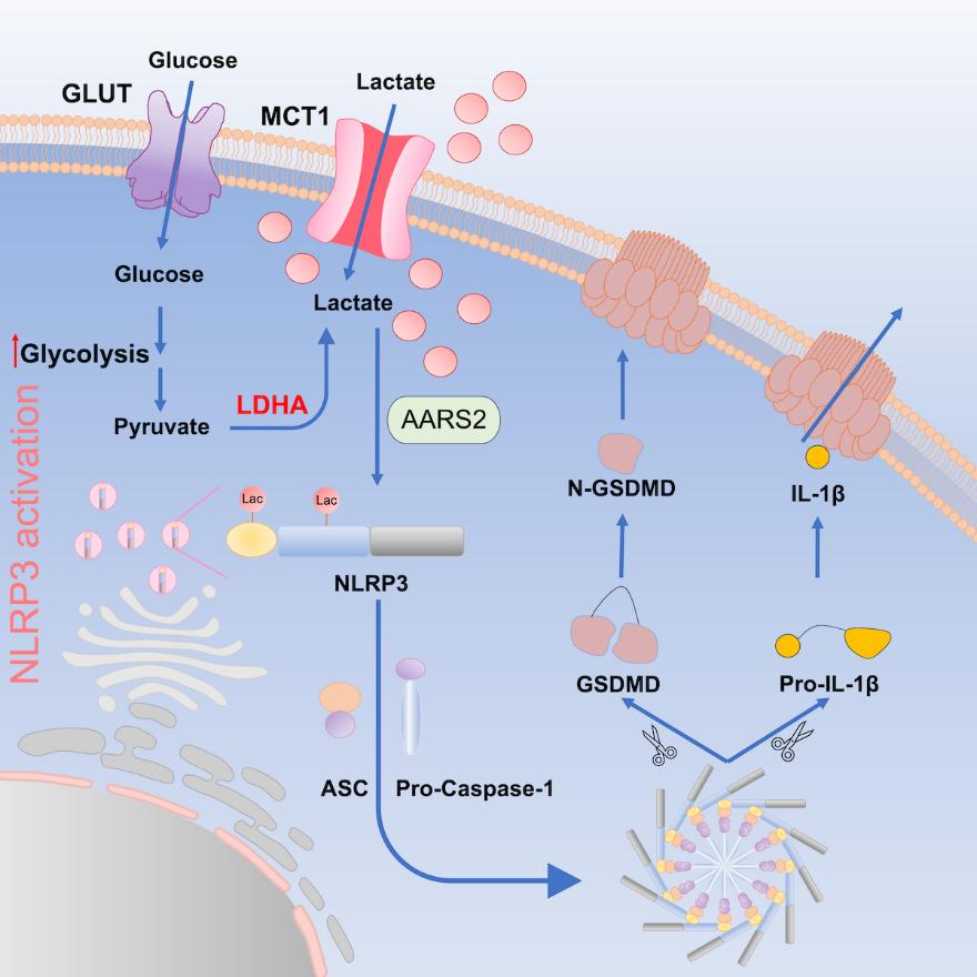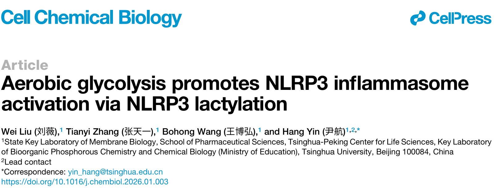 2026年2月4日,清华大学药学院尹航教授课题组在《Cell Chemical Biology》在线发表了题为“Aerobic glycolysis promotes NLRP3 inflammasome activation via NLRP3 lactylation”的研究论文。该研究发现了代谢物乳酸能够直接乳酸化修饰NLRP3,从而调控NLRP3炎症小体激活的新机制,为免疫系统中小分子代谢产物的免疫调节功能提供了新的见解。