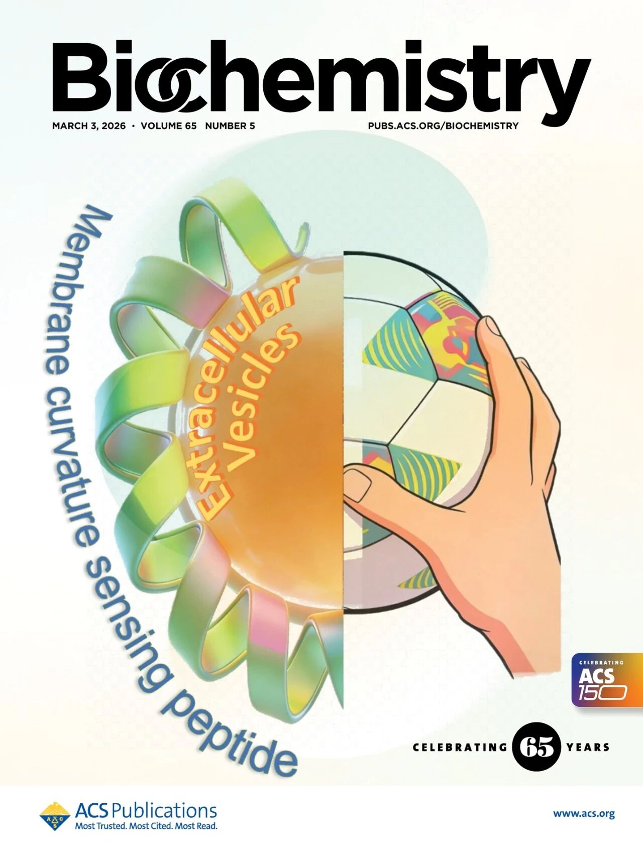 清华大学药学院尹航教授团队在《Biochemistry》特刊“Chemistry and Biology of Peptides”上发表了题为《Chemical Biology Drives Membrane-Curvature-Sensing Peptide Probes for Extracellular Vesicle Capture and Applications》的封面文章。该综述系统总结了团队在膜曲率感应多肽探针设计、改造与应用方面的系列工作,提出了一种基于EVs膜高曲率物理特性的捕获新范式,为EVs研究提供了从基础感知到转化应用的化学生物学工具平台。封面灵感源于作者作为医药学院足球队守门员在扑救来球时,需要合适的手型才能准确的拿到足球,同样地,多肽探针需要合适的曲率才能捕获对应大小的EVs。