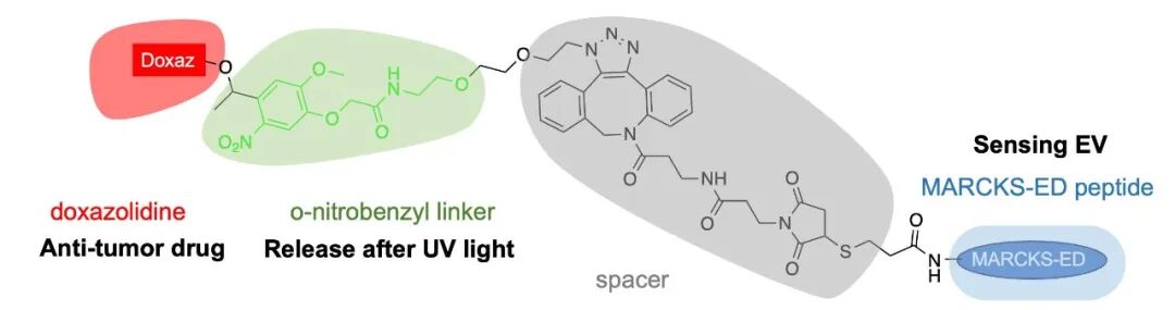 4. 在肽序列中偶联生物正交反应基团(如叠氮、炔基),实现了与荧光基团、亲和标签或固体载体的精准、高效耦联,并用于体内靶向递送药物,构建用于成像、捕获、药物负载的多功能探针。团队构建光激活的MARCKS-ED-Photodox。该前药利用肽的EV靶向能力,富集于肿瘤微环境;在近紫外光照射下,可控释放活性药物分子。这首次实现了利用曲率感知肽进行时空可控的靶向化疗,为癌症治疗提供了新策略。